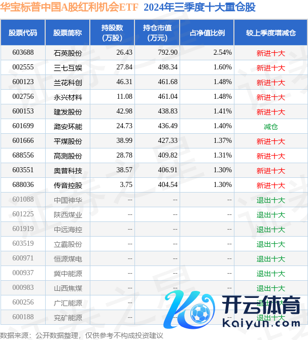 华宝标普中国A股红利契机ETF为指数型-股票基金,字据最新一期基金季报披露,该基金钞票成立:股票占净值比98.01%,无债券类钞票,现款占净值比3.26%。基金十大重仓股如下: