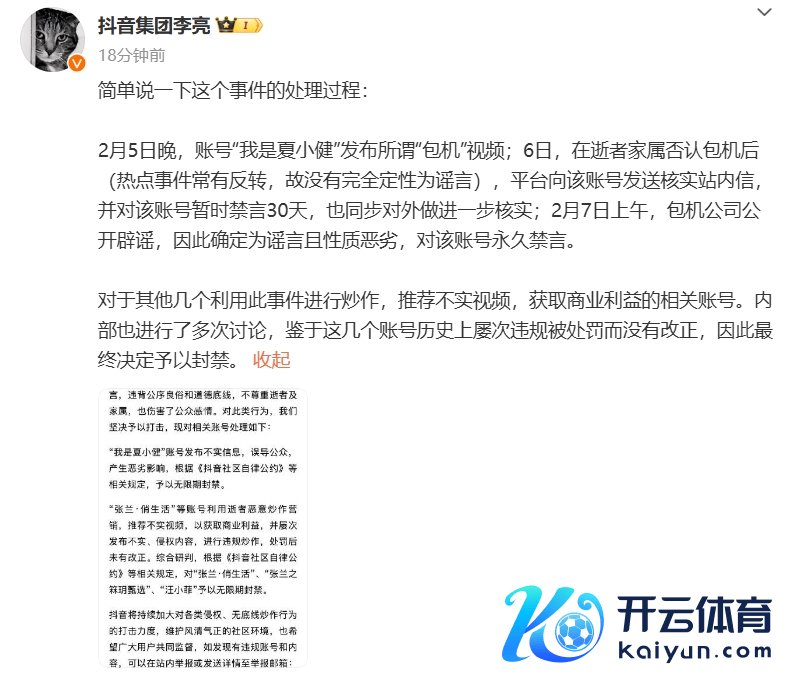 抖音:对张兰、汪小菲等东谈主账号赐与无尽期封禁抖音副总裁李亮示意,张兰、汪小菲等账号多次违章被处罚而莫得改正,最终决定赐与封禁。